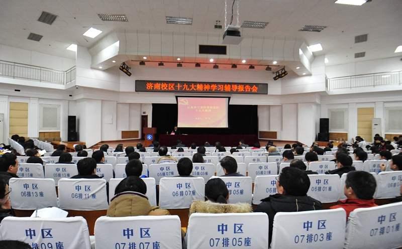 為深入學(xué)習(xí)貫徹黨的十九大精神,深刻領(lǐng)會和全面把握黨的十九大報告的科學(xué)內(nèi)涵和精神實質(zhì),切實把校區(qū)廣大黨員干部的思想認(rèn)識和行動統(tǒng)一到黨的十九大精神上來,12月12日下午,濟南校區(qū)在圖書館報告廳舉辦十九大精神學(xué)習(xí)輔導(dǎo)報告會,校學(xué)習(xí)貫徹黨的十九大精神宣講團副團長,校黨委副書記兼濟南校區(qū)黨委書記、管委會主任尹華為校區(qū)師生作了題為《認(rèn)真學(xué)習(xí)宣傳貫徹黨的十九大精神》的報告。校區(qū)全體教職工,校區(qū)、系學(xué)生會干部,各班班長、團支部書記參加了報告會。