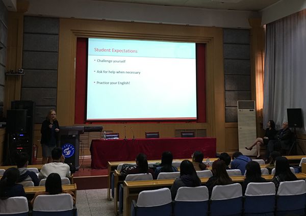 客人還分別與有意向通過3+1+1項(xiàng)目出國學(xué)習(xí)的學(xué)生見面交流,通過視頻展示、PPT介紹以及問題解答,讓學(xué)生對項(xiàng)目有了更深入地了解。在與項(xiàng)目全體新生見面會上,向?qū)W生展示了克拉克大學(xué)的風(fēng)貌,讓學(xué)生更切實(shí)地感受到身為項(xiàng)目一員所具有的優(yōu)勢以及更為明確的發(fā)展方向。