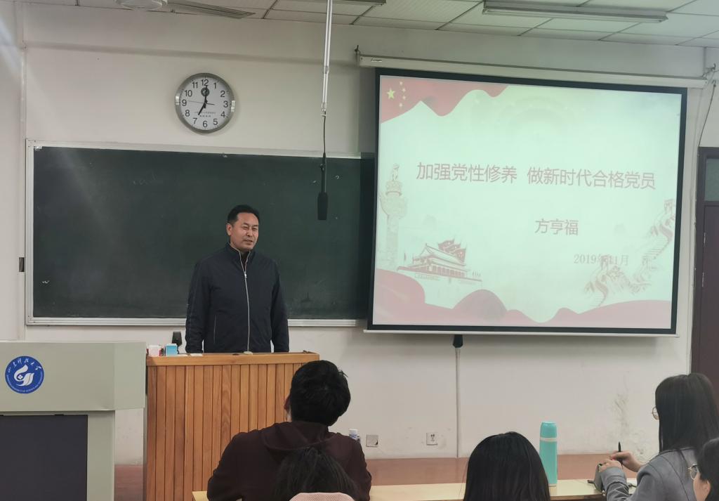 方亨福以“加強黨性修養(yǎng),做新時代合格黨員”為題為電氣信息系黨總支、后勤管理處黨總支全體黨員講黨課